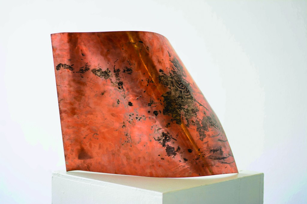 The prints made from the copper plates, pocked, dented and scarred by the act of rebuilding the city, deliver ingenious, textured images while the plates themselves become sculptures. Alongside the gnarled plates and the inspired prints, sit Chrisél’s paintings – also inspired by the city’s memory and history, but invoking a sense of the decayed surfaces which are being rejuvenated.